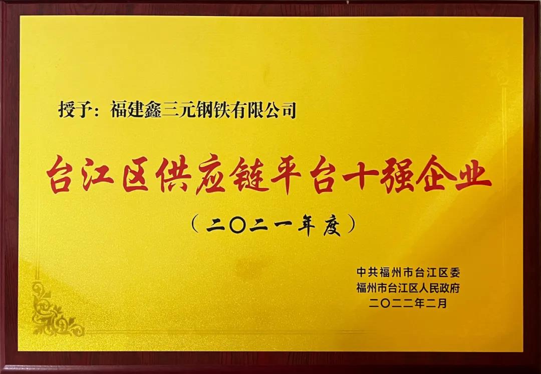 明海鑫旗下福建鑫三元鋼鐵有限公司,榮獲中共福州市臺江區委福州市臺江區人民政府頒發的2021年度“臺江區供應鏈平臺十強企業 ”稱號。