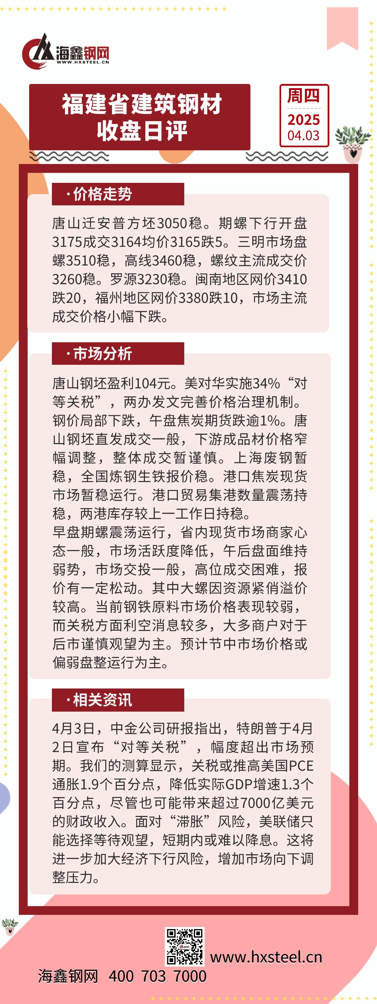 4月3日福建省內(nèi)建筑鋼材收盤日評