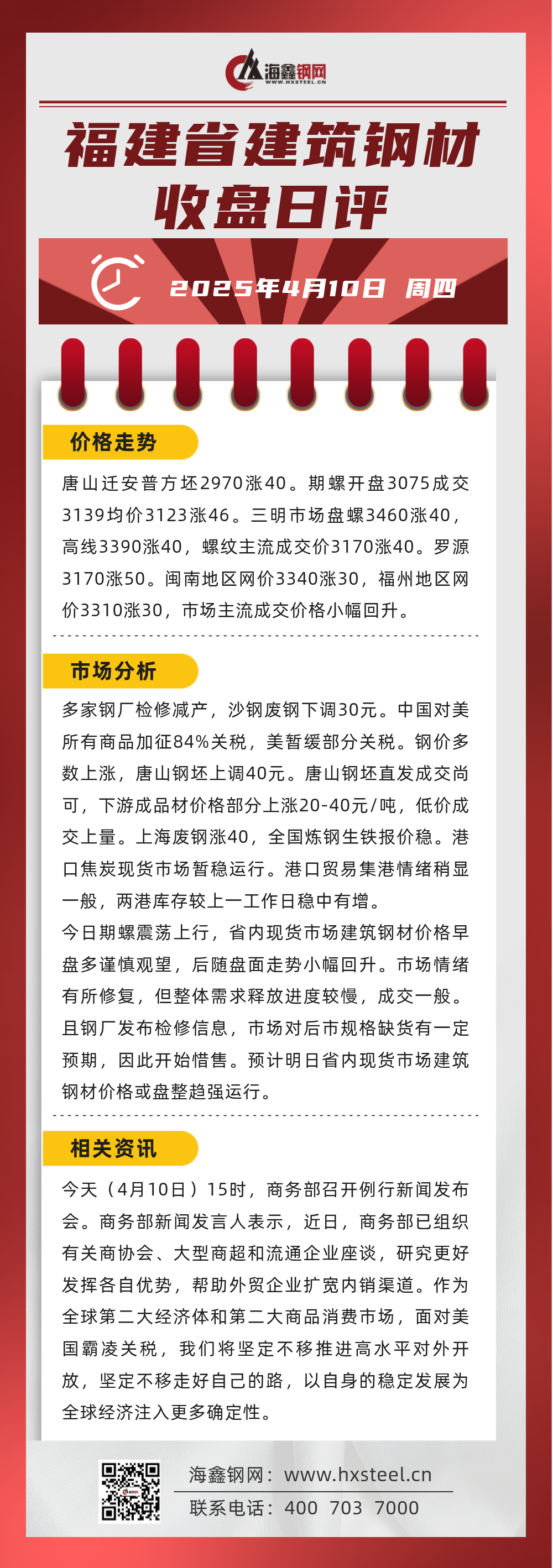 4月10日福建省內建筑鋼材收盤日評