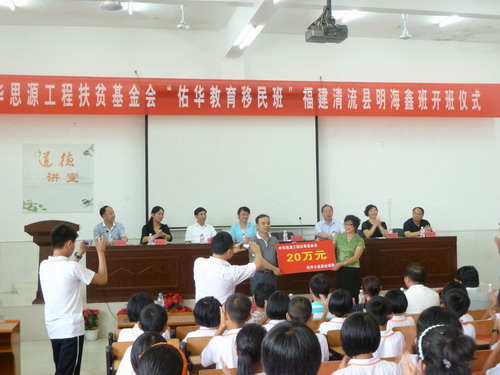 儀式上,王鳳玲、陳敏杰分別代表佑華公益基金和福建明海鑫企業(yè)股份有限公司,向清流縣“思源佑華教育移民班福建清流縣明海鑫班”各捐贈20萬元和10萬元,用于該班50名學生三年的生活補助,每人每年2000元??h教育局局長江長文分別向“中華思源扶貧基金會佑華公益基金”和“福建明海鑫股份有限公司”贈送銅牌,承辦學校城關(guān)中學介紹了“思源佑華教育移民班”的建班情況,并表示一定要履職盡責,把“思源佑華教育移民班”辦成出成績、出人才的勵志班、成功班、示范班。教師、學生、家長代表也先后做了表態(tài)發(fā)言,表示一定不辜負民建各級領(lǐng)導和各界愛心人士的期望,認真學習、努力工作,奉獻社會、報效祖國。